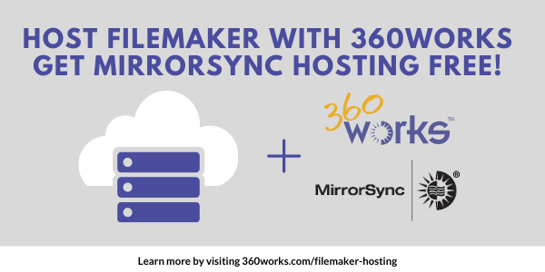 Perhaps, one of the best benefits is that MirrorSync, our award-winning and top selling FileMaker synchronization tool, is pre-installed and hosting for MirrorSync is completely free when you host with 360Works! (You will need to purchase your MirrorSync software separately, but keep in mind... MirrorSync ships with one sync configuration of FileMaker Server to FileMaker Pro or Go, plus one device seat, free of charge!)